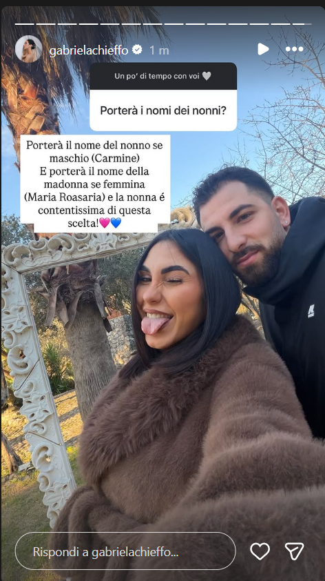 Ecco riportate, di seguito, le parole di Gabriela Chieffo sui social: “Porterà il nome del nonno se maschio (Carmine). E porterà il nome della Madonna se è femmina (Maria Rosaria) e la nonna è contentissima di questa scelta!”.