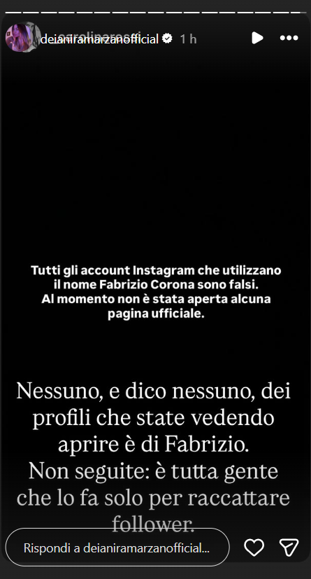 Ecco riportate, di seguito, le dichiarazioni di Deianira Marzano: “Tutti gli account Instagram che utilizzano il nome Fabrizio Corona sono falsi. Al momento non è stata aperta alcuna pagina ufficiale. Nessuno, e dico nessuno dei profili che state vedendo aprire, è di Fabrizio. Non seguite: è tutta gente che vuole solo raccattare follower”.