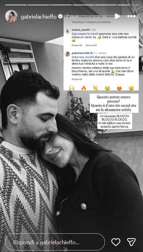 Ecco riportate, di seguito, le dichiarazioni di Gabriela Chieffo sul suo profilo Instagram ufficiale: “Quanto potete essere penose? Questo è il lato dei social che mi fa altamente schifo. Ovviamente blocco, blocco, blocco. Di mio figlio/a non dovete neanche aprire bocca”.