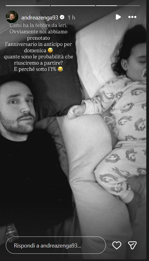 Ecco riportate, di seguito, le dichiarazioni di Andrea Zenga sul suo profilo Instagram ufficiale: “Cami ha la febbre da ieri. Ovviamente noi abbiamo prenotato l’anniversario in anticipo per domenica. Quante sono le probabilità che riusciremo a partire? E perché sotto l’1%?”, ha scritto tra il serio e il faceto il compagno di Rosalinda Cannavò.