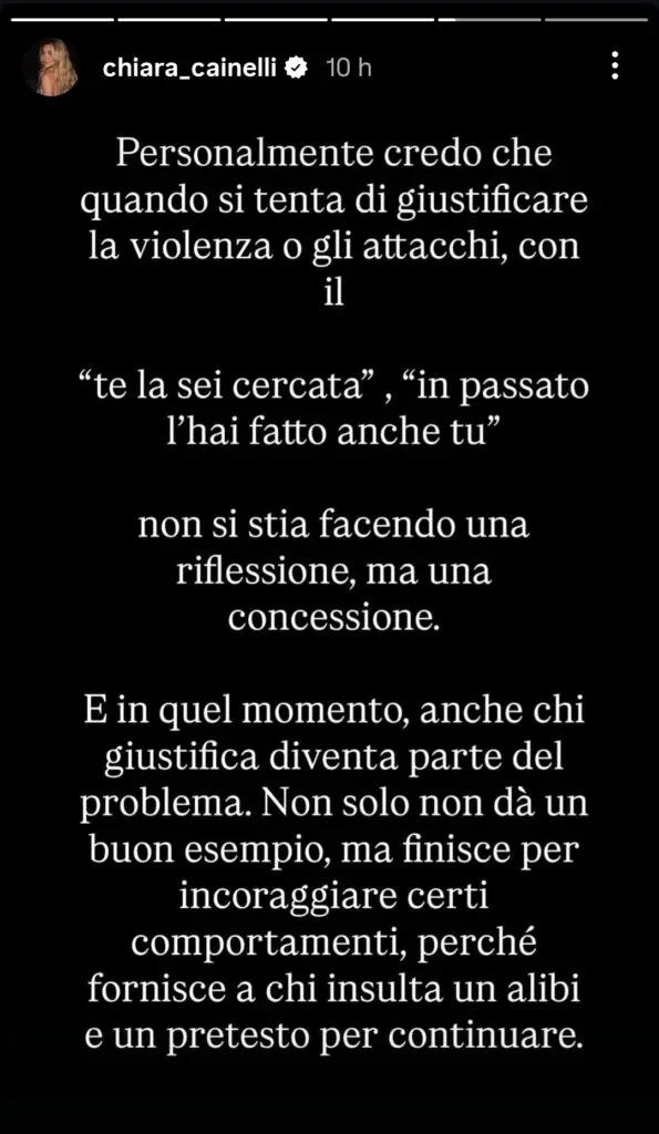 Nel suo messaggio finale, Chiara Cainelli ribadisce un concetto chiave: giustificare la violenza, anche solo a parole, significa diventarne parte. E rivendica la scelta di continuare a esporsi e a parlare, ma solo in un dialogo guidato da rispetto e responsabilità. Una replica a freddo che non cerca lo scontro, ma apre una riflessione più ampia sul confine — spesso sottile — tra confronto televisivo e processo mediatico.
