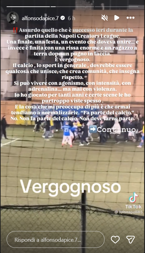Ecco riportate, di seguito, le dichiarazioni di Alfonso D’Apice online: “Assurdo quello che è successo ieri durante la partita della Napoli Creators League. Una finale, una festa, un evento che doveva unire… e invece è finita con una rissa enorme e un ragazzo a terra dopo un pugno in faccia.. è vergognoso. Il calcio, lo sport in generale, dovrebbe essere qualcosa che unisce, che crea comunità, che insegna rispetto. Si può vivere con agonismo, con intensità, con adrenalina… ma mai con violenza. Io ho giocato per tanti anni e certe scene le ho purtroppo viste spesso. E la cosa che mi preoccupa di più è che ormai tendiamo a normalizzare, dicendo che fa parte del calcio. No. Non fa parte del calcio. Non deve farne parte!”.