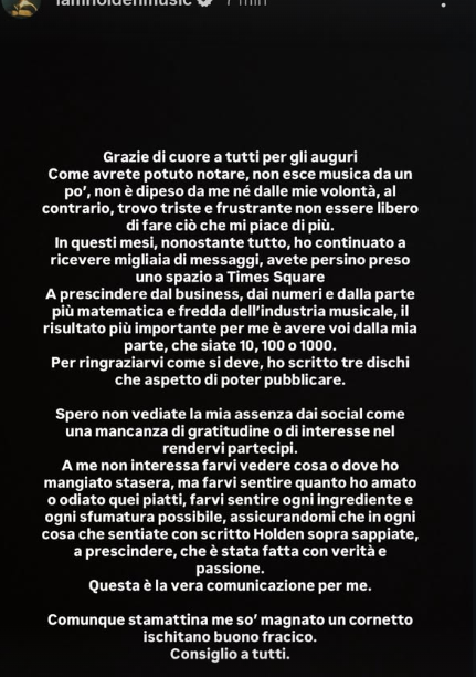 HOLDEN, LA POLEMICA CONTRO IL SISTEMA DELLA MUSICA: LE PAROLE DELL’EX AMATO VOLTO DI AMICI 24- In queste ore, l’ex amatissimo concorrente della ventiquattresima edizione del talent show di Canale5 al cui timone abbiamo stabilmente la regina di Mediaset, Maria De Filippi, ha pubblicato un attacco al sistema musicale sul suo profilo Instagram ufficiale. Scopriamo insieme cos’ha scritto sui social Joseph Carta, in arte Holden.