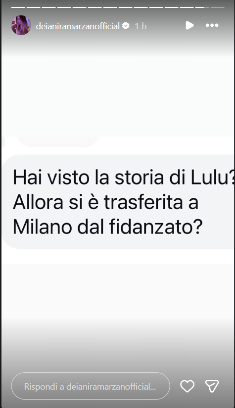 Ecco riportate, di seguito, le dichiarazioni di Deianira Marzano sul suo Profilo Instagram ufficiale: “Hai visto le storie di Lulù? Allora si è trasferita a Milano dal fidanzato?”.