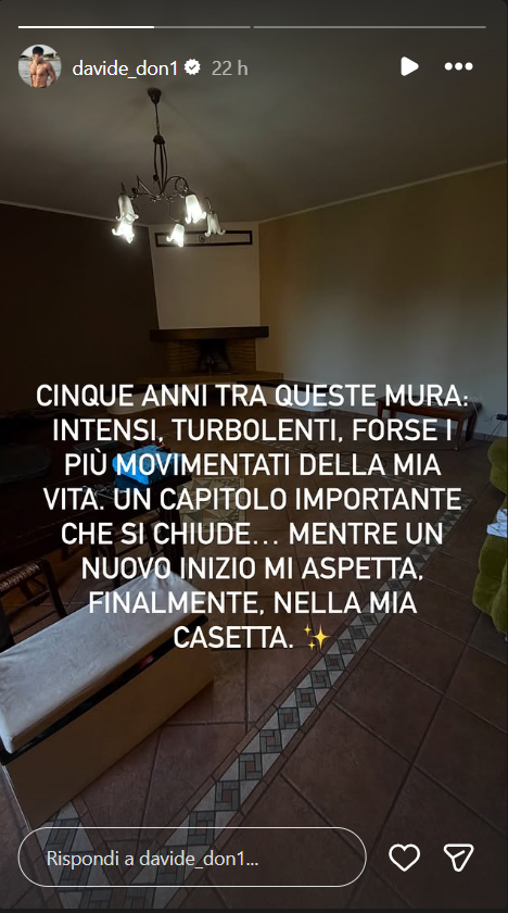 Ecco riportate, di seguito, le parole di Donadei: “Cinque anni tra queste mura: intensi, turbolenti, forse i più movimentati della mia vita. Un capitolo importante che si chiude, mentre un nuovo inizio mi aspetta. Finalmente, nella mia casetta”.