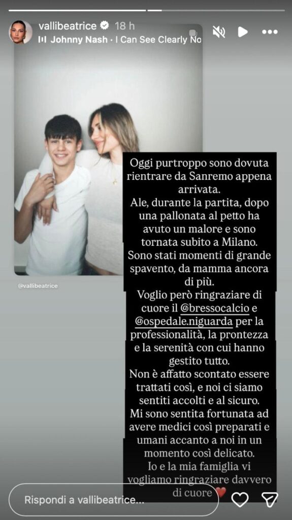 Secondo le costruzioni una pallonata prova col petto facendolo prima sentire male e poi scattare l’allarme tra allenatori e presenti, che hanno informato la famiglia e Beatrice è corsa da lui: “Dopo una pallonata al petto ha avuto un malore e sono tornata subito a Milano”, ha scritto sui social. Alessandro è stato trasportato all’Ospedale Niguarda, dove è stato preso in cura dal personale sanitario.