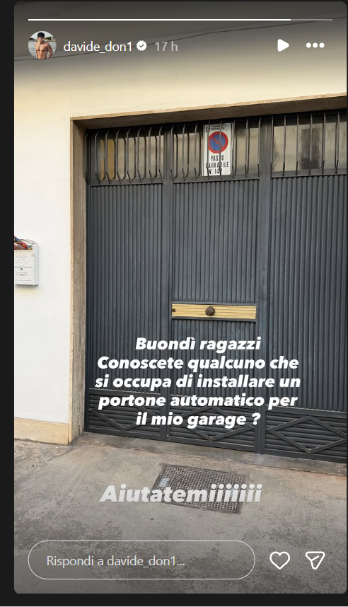 Ecco riportate, di seguito, le parole di Davide su Instagram: “Ragazzi conoscete qualcuno che si può occupare di installare un portone automatico per il mio garage?”.