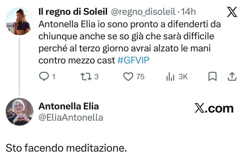 Una battuta che richiama il carattere forte e spesso imprevedibile della Elia, famosa per non tirarsi mai indietro quando si tratta di scontri televisivi. La risposta della diretta interessata non si è fatta attendere. Con poche parole, ma con grande ironia, Antonella Elia ha replicato così:”Sto facendo meditazione”.