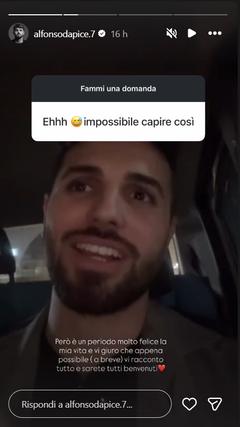 Ecco riportate, di seguito, le parole di Alfonso D’Apice: “Un periodo molto felice per me, della mia vita. A breve vi svelerò tutto”.