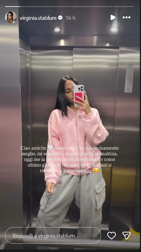 Ecco riportate, di seguito, le dichiarazioni di Virginia Stablum sui social: “Ciao amiche, come state? Io sto decisamente meglio, mi sembra di essere risorta stamattina, oggi me la prendo ancora con comodo come ultimo giorno di recupero e da domani si ricomincia a macinare”.