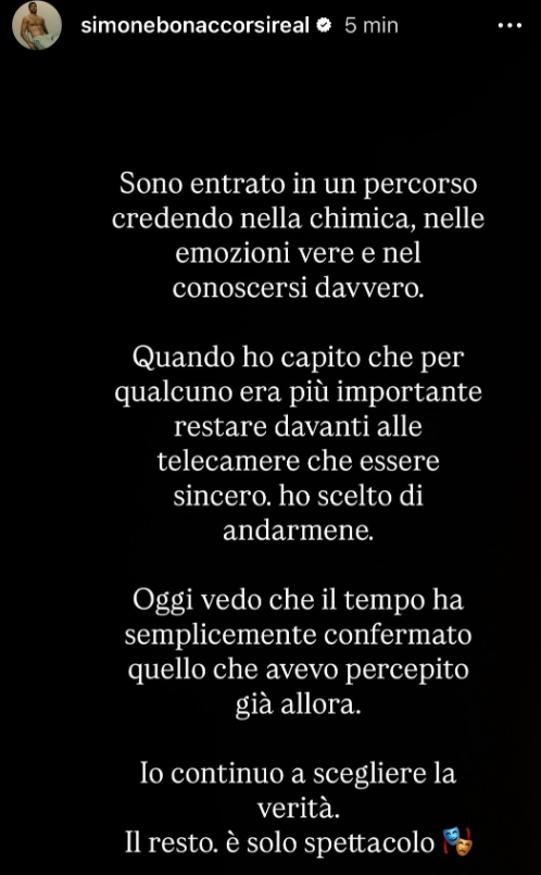 Ecco le dichiarazioni di Simone su Instagram: “Sono entrato in un percorso credendo nella chimica, nelle emozioni vere e nel conoscersi davvero”, ha affermato Bonaccorsi sui social.