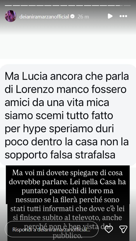 Di seguito, le dichiarazioni di Deianira Marzano sui social networks: “Ma voi mi dovete spiegare di cosa dovrebbero parlare. Lei nella Casa ha puntato parecchi di loro ma nessuno se la filerà perché sono stati tutti informati che dove c’è lei si finisce subito al televoto, anche perché non è ben vista dal pubblico”.