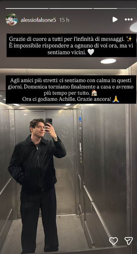 Ecco riportate, di seguito, le dichiarazioni di Falsone sui suoi canali social ufficiali: “Grazie di cuore a tutti per l’infinità di messaggi.. è impossibile rispondere a ognuno di voi ora, ma vi sentiamo vicini. Agli amici più stretti: ci sentiamo con calma in questi giorni. Domenica torniamo finalmente a casa e avremo più tempo per tutto. Ora ci godiamo Achille. Grazie ancora!”.