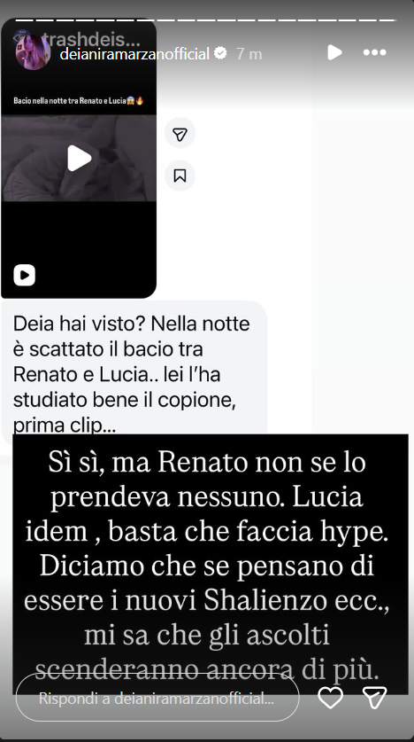 Ecco riportate, di seguito, le dichiarazioni di Deianira Marzano: “Sì sì, ma Renato non se lo prendeva nessuno. Lucia idem, basta che faccia hype. Diciamo che se pensano di essere i nuovi Shailenzo, mi sa che gli ascolti scenderanno ancora di più”.