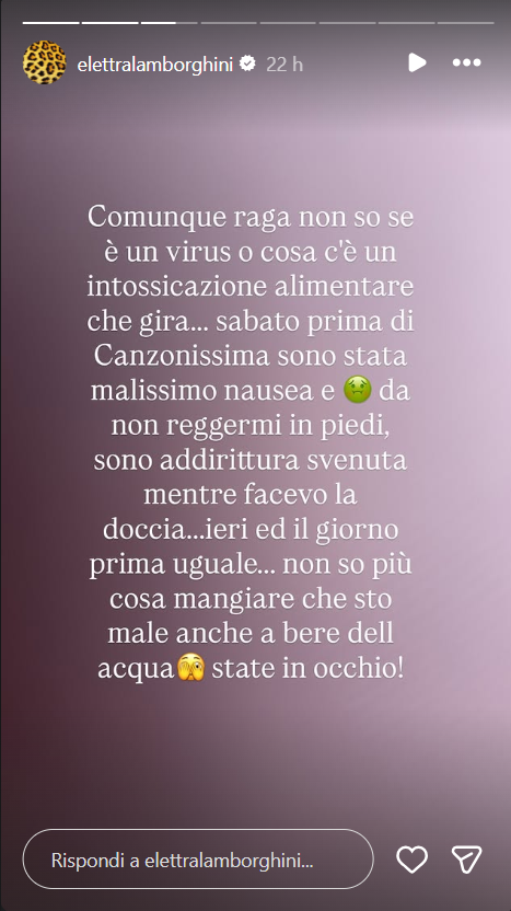 Ecco riportate, di seguito, le dichiarazioni di Elettra: “Comunque raga non so se è un virus o cosa c’è un’intossicazione alimentare che gira.. sabato prima di Canzonissima sono stata malissimo.. nausea e vomito da non reggermi in piedi, sono addirittura svenuta mentre facevo la doccia.. ieri ed il giorno prima uguale.. non so più cosa mangiare che sto male anche a bere dell’acqua! State in occhio!”.