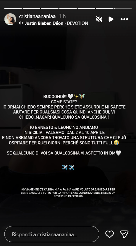 Ecco riportate, di seguito, le dichiarazioni di Cristiana Anania: “Buondì! Come state? Io ormai chiedo sempre perché siete assurdi e mi sapete aiutare per qualsiasi cosa, quindi anche qui, vi chiedo.. magari qualcuno sa qualcosina! Io, Ernesto e Leoncino andiamo in Sicilia, Palermo, dal 2 al 10 aprile, e non abbiamo ancora trovato una struttura che ci può ospitare per quei giorni perché sono tutti full. Se qualcuno di voi sa qualcosina, vi aspetto in direct messages. (Ovviamente c’è casina mia a Palermo, ma avrei voluto organizzare per bene i bagagli e tutto per la ripartenza, quindi sarebbe meglio un posticino in centro”.