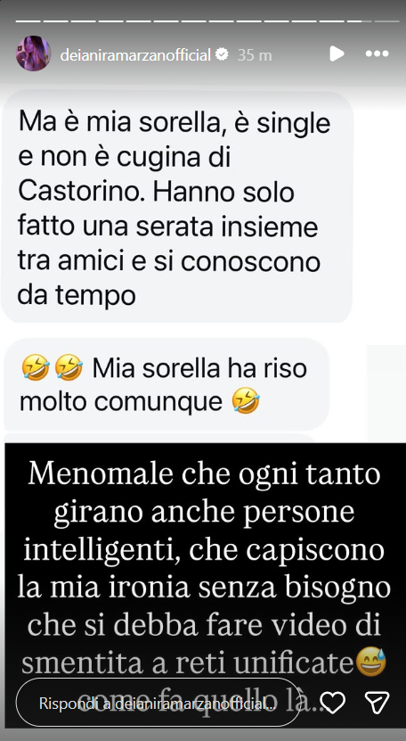 Ecco riportate, di seguito, le parole della sorella della ragazza: “Ma è mia sorella, è single e non è cugina di Castorino. Hanno solo fatto una serata insieme tra amici e si conoscono da tempo. Mia sorella ha riso molto comunque”.