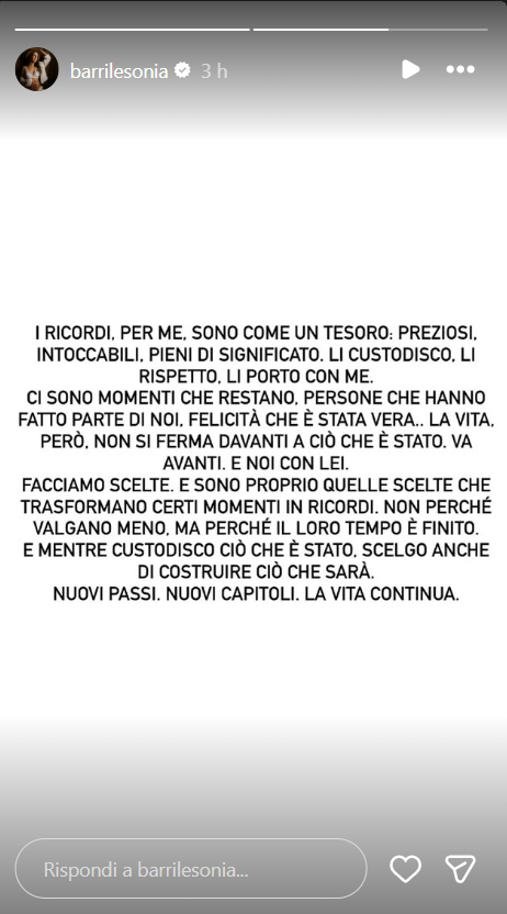 Ecco riportate, di seguito, le parole di Sonia: “I ricordi, per me, sono come un tesoro: preziosi, intoccabili, pieni di significato. Li custodisco. Li rispetto. Li porto con me. Ci sono momenti che restano, persone che hanno fatto parte di noi. Felicità che è stata vera.. la vita, però, non si ferma davanti a ciò che è stato. Va avanti. E noi con lei”.