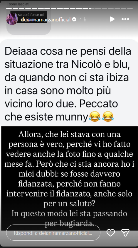 Ecco riportate, di seguito, le dichiarazioni di Deianira Marzano: “Allora, che lei stava con una persona è vero, perché vi ho fatto vedere anche la foto fino a qualche mese fa. Però che ci stia ancora ho i miei dubbi: se fosse davvero fidanzata, perché non fanno intervenire il fidanzato, anche solo per un saluto? In questo modo lei sta passando per bugiardo”.